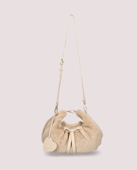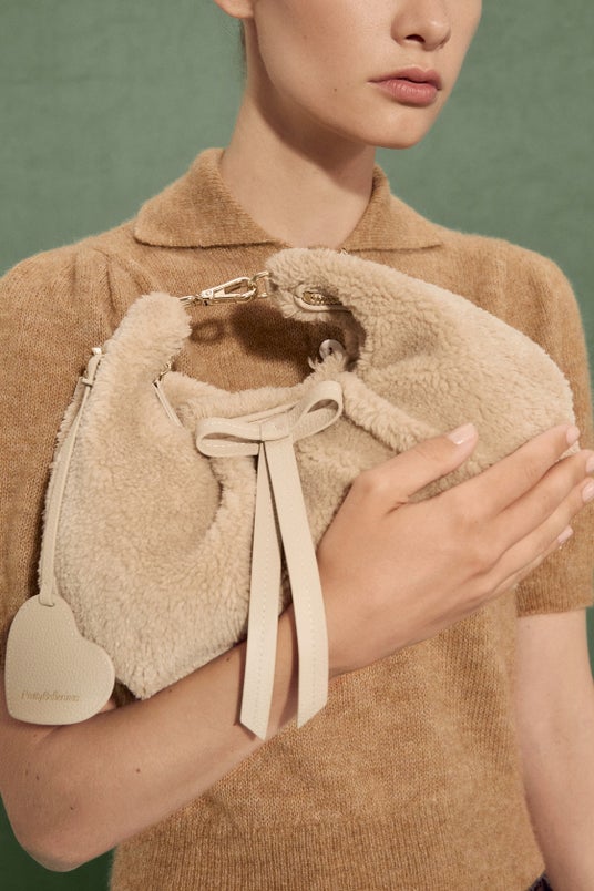 ふわふわのシアリング素材が目を惹く、秋冬ならではのウォーム感あふれるバッグ。ころんとした丸みのあるフォルムに、リボンとハートチャームでブランドらしさをプラス。柔らかく軽やかな印象で、シンプルな装いにこそ映える一品です。