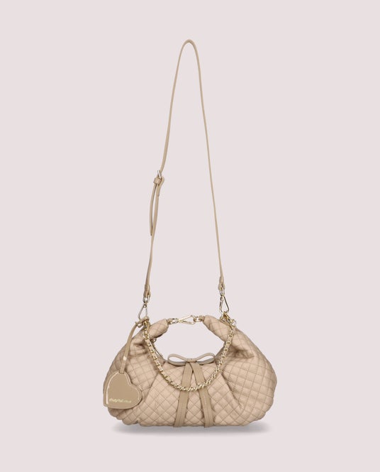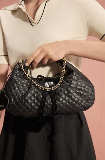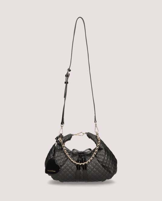 クラシカルなキルティングに、さりげないリボンモチーフとゴールドチェーンを組み合わせたレザーバッグ。ハート型のチャームが愛らしくも上品で、ショルダー&ハンドの2WAY仕様。エッジの効いたブラックと、ニュアンスのあるアイボリーがラインナップ。