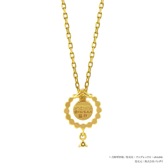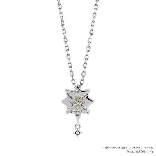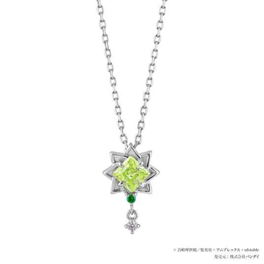 鍔をイメージしたフォルムにグリーンの石をセッティングしたネックレスです。中央には大ぶりでシャープなスクエアの石を使用し、荒々しさと風の呼吸の鋭さを表現。下には羽織や髪色をイメージしたクリアな石が揺れてきらめきます。裏側には胸の大きな傷を刻んでいます。
