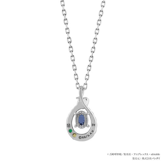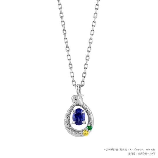 伊黒小芭内をイメージした青紫の石を蛇が取り巻くようにデザインしたネックレスです。鍔の形を思わせるオーバルの石が中央で深い輝きを放ち、蛇の背に留められたイエローとグリーンの石で特徴的なオッドアイを表現しました。中央の石の裏側には羽織をイメージした縞模様が刻まれています。