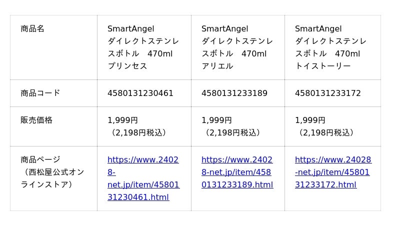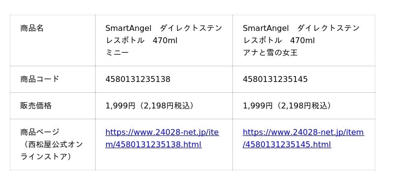 株式会社西松屋チェーン(兵庫県姫路市、代表取締役社長 大村 浩一)は、プライベートブランド「SmartAngel(スマートエンジェル)」の新商品として、好評発売中の「SmartAngel ダイレクトステンレスボトル470ml」に、新たに「ミニー」と「アナと雪の女王」の2デザインを追加し、全国の当社店舗および西松屋公式オンラインストアにて、販売を開始いたしました。