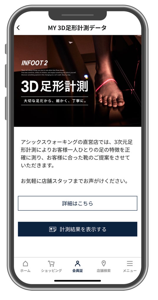本機能は、「ASICS Walking公式アプリ」をダウンロード・会員登録したうえで、アシックスウォーキング直営店の全店舗で導入している「INFOOT 2」で足形を計測※していただくことで利用できます。