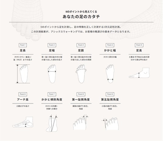 3次元足形計測機「INFOOT 2」は、赤色レーザー光を8台のカメラで撮像し足の3D形状を計測するもので、足長・足幅・足囲・かかと幅・足高・アーチ高・かかと傾斜角度・第一趾側角度・第五趾側角度の9つの項目を片足あたり2~3秒で計測します。これらの計測データをシューズ選びの基本とし、専門スタッフがお客さまのご要望に応じて、足に合った靴をご提案します。「INFOOT 2」はアシックスウォーキング直営店全店で導入しており、どなたでも無料でご利用いただけます。