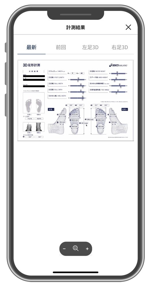 これまで、アシックスウォーキング直営店では計測した足形データを紙でお渡ししていましたが、「3D足形計測データ」閲覧機能の追加により、スマートフォン上でより手軽にアクセスできるようになりました。リアル店舗はもちろん、アシックスウォーキングオンラインストアでのお買い物時にも、靴選びの参考として活用できます。また、定期的に計測しながら足形データの変化を確認できるよう、過去2回分の計測結果を閲覧できるようにしています。さらに、数的な計測結果だけではなく、画面上に表示された3Dの足形画像を指でなぞりながら動かしていただくことで、足形を360度見ることもできます。