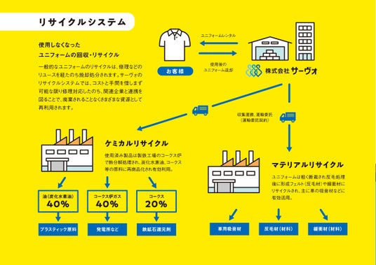 ユニフォームアパレルの総合メーカーである株式会社サーヴォ(本社:東京都中央区 代表取締役社長:植田文裕)は、かねてより主力事業の一つであるユニフォームのレンタルサービスを2025年4月よりリニューアルしました。今回新たに発表した「ユニサイクル」では、これまで好評頂いている「クオリティの高いリユース」、「利便性の高いWEBシステム」などのサービスはそのままに、本事業で排出される使用済みユニフォームの全量リサイクル処理を打ち出し、ユニフォームを通した企業のSDGs活動をサポートする事で、循環社会の実現に向けた貢献を可能にしました。