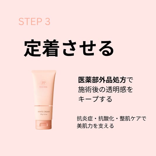 医薬部外品仕様のピンクキープクリームが、施術後の透明感をやさしく守り、美肌力を支えます。