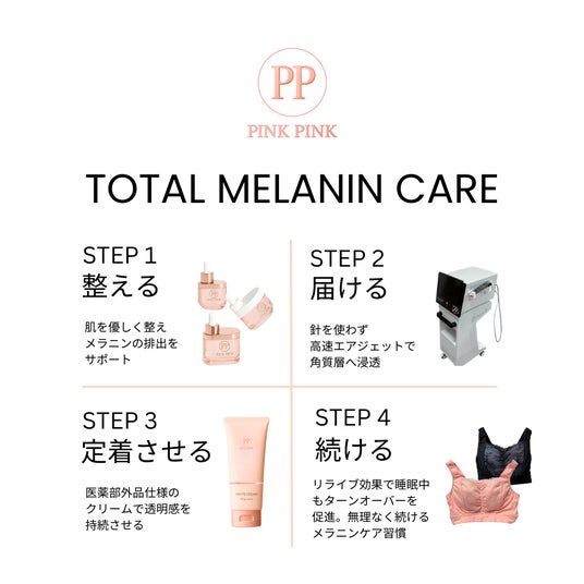 PINK PINKは、日本国内製造の薬剤・高浸透施術・アフターケア・ホームケアまでをワンパッケージで提供する、トータルメラニンケアブランドです。