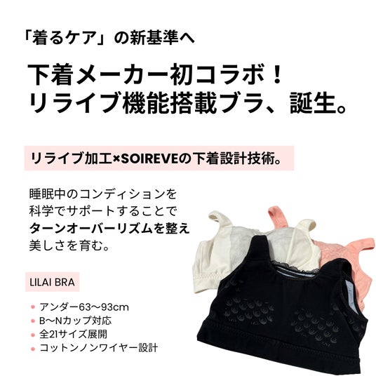 下着メーカー初コラボとなる、リライブ機能搭載ナイトブラが誕生。リライブ加工×SOIREVE設計の新発想で、肌も心もやさしく整える。睡眠中のコンディションを科学的にサポートし、ターンオーバーリズムを促進。深い眠りへ導き、確かな実感と美しさを、すべての女性へ。