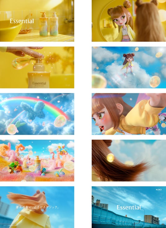新CMでは、傷んだ髪に悩む一人の女の子が主人公。ある日、鏡の中のもうひとりの自分に促され、シャンプーに触れた瞬間にCGの世界に導かれます。そこはまるで“Essential”がつくり出すHAPPYな異世界。幻想的でポップな空間には不思議なとろとろの黄色い玉が漂っており、その玉が髪に触れるとダメージ髪もトゥルンとまとまっていきます。美しい髪をなびかせながら彼女は、笑顔と自信を携えて、再び現実の世界へと駆け出していきます。そんな前向きなストーリーを、CGならではの表現とカラフルなビジュアルで描き、見た人の心も軽くなるようなポジティブな変化を感じさせるCMに仕上げました。