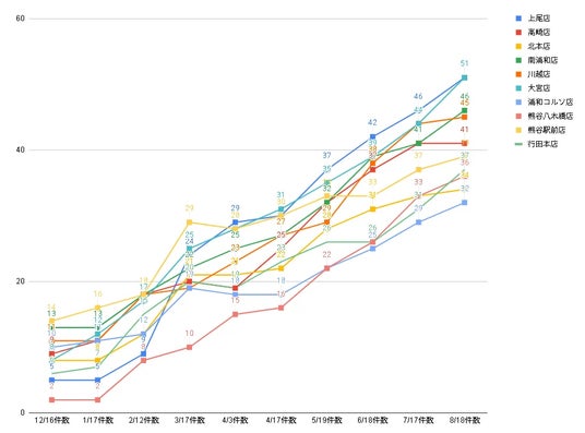 - 口コミ推移:全店舗で右肩上がり、50件目前の店舗も多数