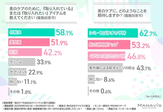 そこで今回、株式会社マナビス化粧品(https://www.manavis-cosme.co.jp/)は、美容・健康意識の高い20~50代の男女を対象に、「美白ケアを始めるタイミング」に関する調査を実施しました。
