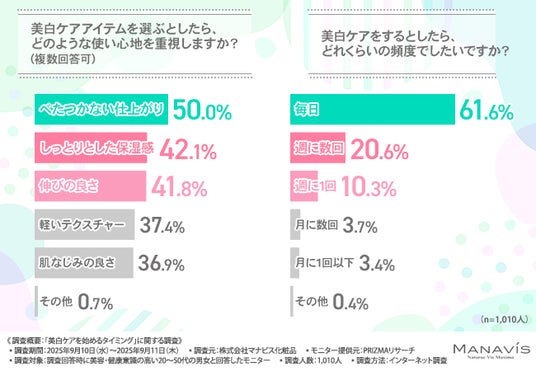 美白ケアアイテムの選定においては、半数が『べたつかない仕上がり』を重視するようです。