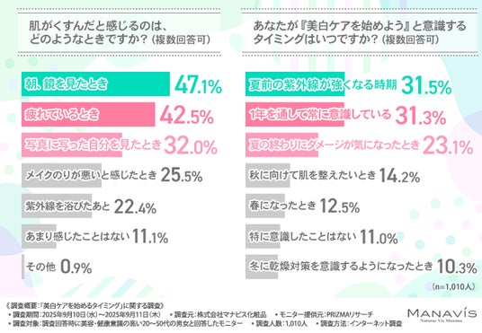 株式会社マナビス化粧品(所在地:千葉県浦安市、代表取締役社長:兼子 慎一)は、美容・健康意識の高い20~50代の男女を対象に、「美白ケアを始めるタイミング」に関する調査を実施しました。