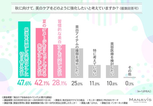 「秋に向けて、美白ケアをどのように強化したいと考えているか」について尋ねたところ、『保湿を重視した美白ケアに切り替えたい(47.6%)』が最多で、『夏のダメージをリセットできる集中ケアをしたい(42.1%)』『習慣的な美白ケアを見直したい(28.1%)』となりました。