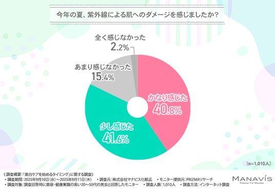 「今年の夏、紫外線による肌へのダメージを感じたか」について尋ねたところ、約8割が『かなり感じた(40.8%)』『少し感じた(41.6%)』と回答しました。