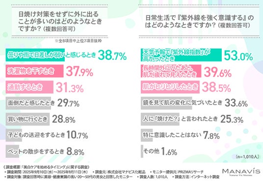 はじめに、「日焼け対策をせずに外に出ることが多いのはどのようなときか」について尋ねたところ、『曇りや雨で日差しが弱いと感じるとき(38.7%)』が最も多く、『洗濯物を干すとき(37.9%)』『通勤するとき(31.3%)』となりました。