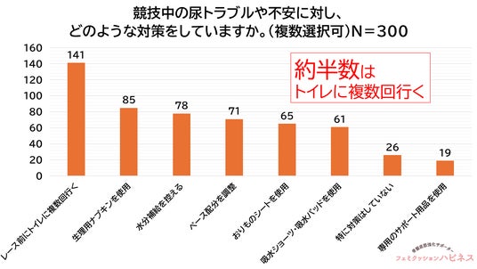 競技中の尿トラブルや不安に対する対策として最も多かったのは、「レース前にトイレに複数回行く」で47.0%(141人)でした。次いで「生理用ナプキンを使用」が28.3%(85人)、「水分補給を控える」が26.0%(78人)、「ペース配分を調整」が23.7%(71人)でした。