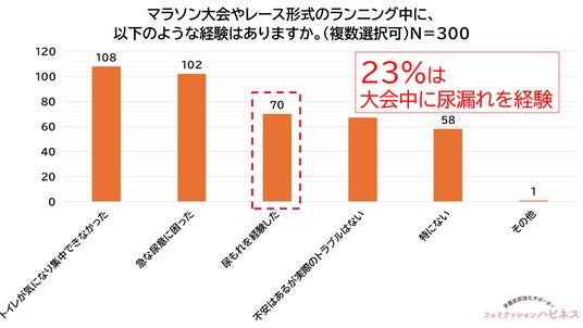 マラソン大会やレース形式のランニング中の経験を尋ねたところ、「トイレが気になり集中できなかった」と回答した人は36.0%(108人)、「急な尿意に困った」は34.0%(102人)でした。さらに、23.3%(70人)が「尿漏れを経験した」と回答しています。