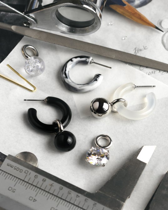 ピアスは、フープタイプのピアス本体と、丸いフォルムが美しいパーツをセットでお選びいただきます。セットのみの販売です。