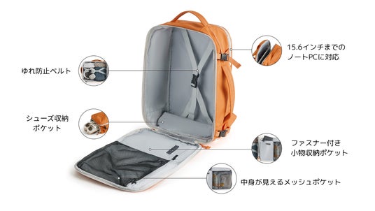 内部にはシューズ用収納スペースやPC専用ポケット、