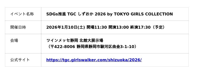 【SDGs推進 TGC しずおか 2026 by TOKYO GIRLS COLLECTION 開催概要】