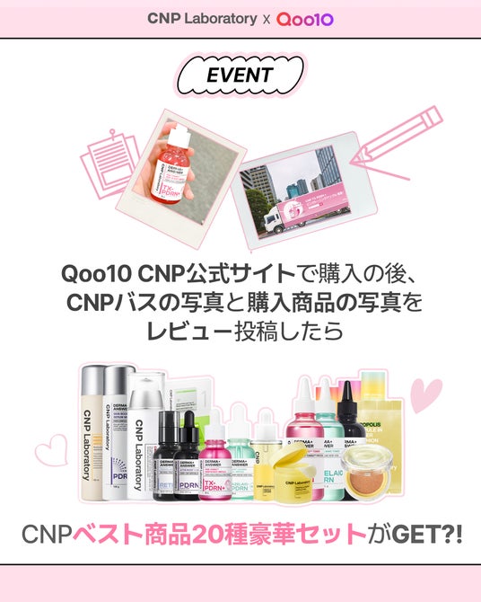 街中で見て「ピンクトーニング ディープインショットアンプル 30ml」をQoo10公式ショップにて購入していただいき「ピンクバスの写真&実際の購入商品」の写真と一緒にフォトレビューを残してくれたお客様から抽選10名様に「CNPベスト商品20種豪華セット」をプレゼント!