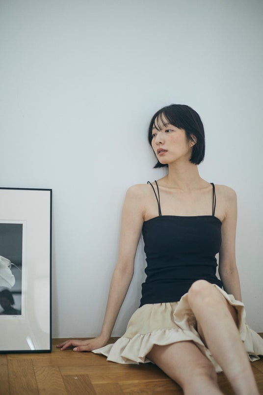 華奢なダブルストラップがデコルテを美しく際立たせ、インナー感を抑えたデザインは1枚で着ても洗練された印象に。