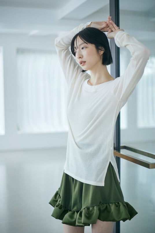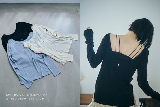 『OPEN BACK SHEER LOUNGE TOP』とのレイヤードで、素肌の美しさが引き立つ、気品を感じるスタイルに。