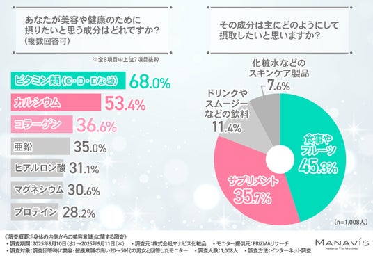 株式会社マナビス化粧品(所在地:千葉県浦安市、代表取締役社長:兼子 慎一)は、美容・健康意識の高い20~50代の男女を対象に、「身体の内側からの美容意識」に関する調査を実施しました。