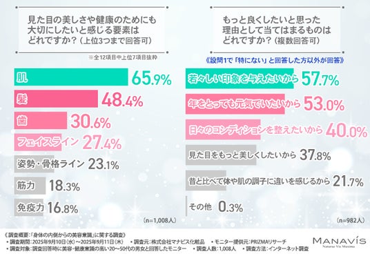 そこで今回、株式会社マナビス化粧品(https://www.manavis-cosme.co.jp/)は、美容・健康意識の高い20~50代の男女を対象に、「身体の内側からの美容意識」に関する調査を実施しました。