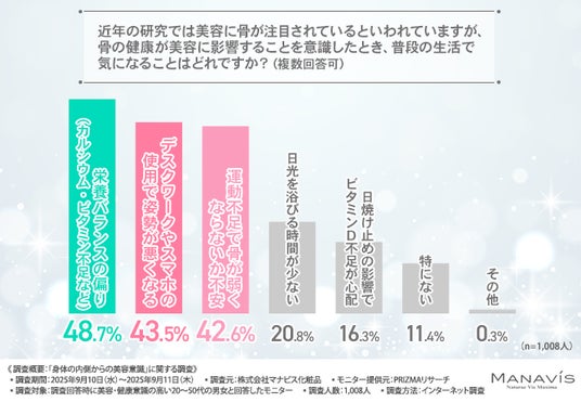 「近年の研究では美容に骨が注目されているといわれていますが、骨の健康が美容に影響することを意識したとき、普段の生活で気になること」について尋ねたところ、『栄養バランスの偏り(カルシウム・ビタミン不足など)(48.7%)』と回答した方が最も多く、『デスクワークやスマホの使用で姿勢が悪くなる(43.5%)』『運動不足で骨が弱くならないか不安(42.6%)』となりました。