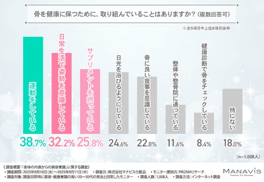 「骨を健康に保つために、取り組んでいること」について尋ねたところ、『運動をしている(38.7%)』と回答した方が最も多く、『日常生活で姿勢を意識している(32.2%)』『サプリメントを摂っている(25.8%)』となりました。