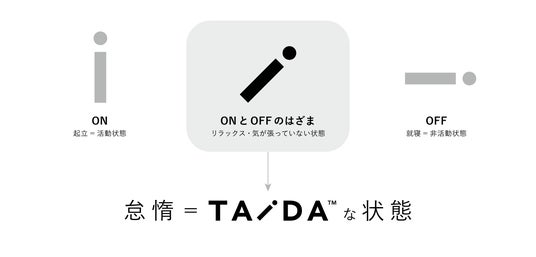 TAiDAのロゴに用いられている斜めの「 i 」は、活動状態(ON)と非活動状態(OFF)の"あいだ"を象徴しています。完全に立ち上がっているわけでも、横たわっているわけでもない。 この「ちょうど中間」の状態は、気を張らず、頑張りすぎず、ただ"怠惰でいる"自分をそのまま認めている姿です。