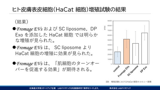 表皮細胞増殖試験では、Fromage EVs が ヒト幹細胞由来エクソソームと同等レベルの細胞増殖促進作用を示しました。