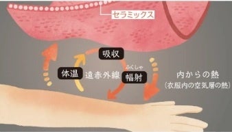 FILCERA(R)の繊維原料には独自に配合した特殊セラミックの粉体が練りこまれています。着用者の身体から放射された、遠赤外線の熱エネルギーをセラミック繊維(FILCERA(R))が吸収し輻射することで保温します。