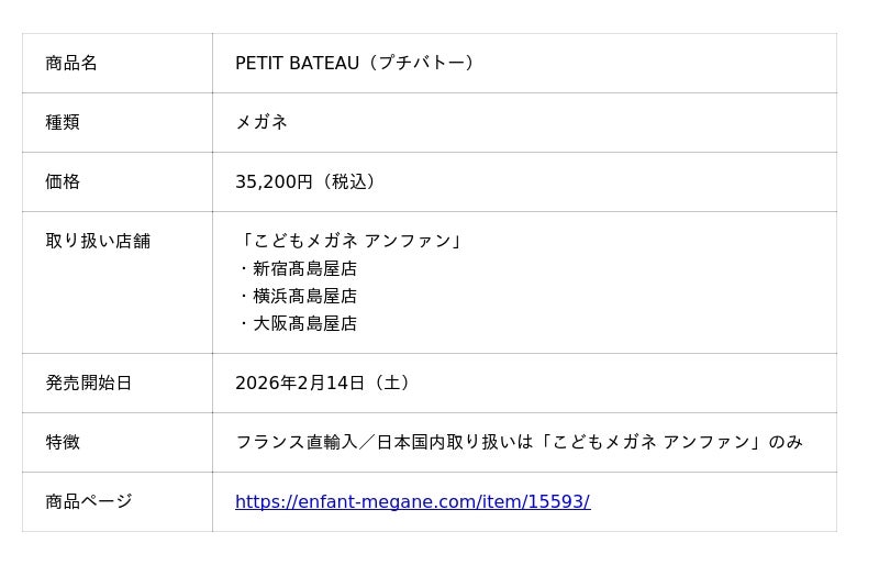 「オグラ眼鏡店」「こどもメガネ アンファン」を展開している株式会社オグラ(本社:東京都千代田区、代表取締役社長:小倉 信典)は、、フランスの老舗ブランド「PETIT BATEAU(プチバトー)」の子ども向けアイウェアコレクションを、2026年2月14日(土)より、新宿高島屋店・横浜高島屋店・大阪高島屋店の3店舗限定で販売開始いたします。