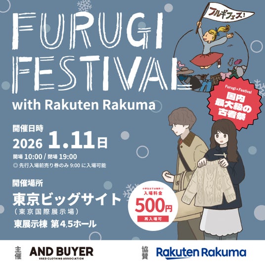 一般社団法人AND BUYER(アンドバイヤー)は、2026年1月11日(日)に東京ビッグサイトで「古着フェス(R) with Rakuten Rakuma」を開催します。2017年に始まった「古着フェス(R)」は今回で10回目を迎え、今や冬の定番イベントとして定着しています。今回は東京ビッグサイト東展示棟4・5ホールの広さ約17000平方メートル (約5150坪)に全国から約300ブース以上の有名ショップから隠れた名店、ネット限定ショップまで勢揃い!リーズナブルな価格帯から貴重なヴィンテージアイテムまで、多彩な古着が並ぶこのイベントは、初心者からコアな古着ファンまで、誰もが楽しめる内容です。さらに、ヴィンテージポスターやブランドアクセサリーなど、古着以外のショップも登場し、幅広い魅力を体感いただけます。先行入場前売り券は11月14日より販売中!
