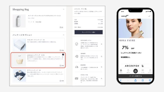 「パッケージオプション」でシェアバッグを選択すると、「ROSA FAYRE」の商品がシェアバッグで届きます。シェアバッグを選んだ消費者は、ゴミやCO2排出量の削減に貢献できるだけでなく、梱包ストレス(※)を軽減したりクーポンなどの特典を獲得できます。
