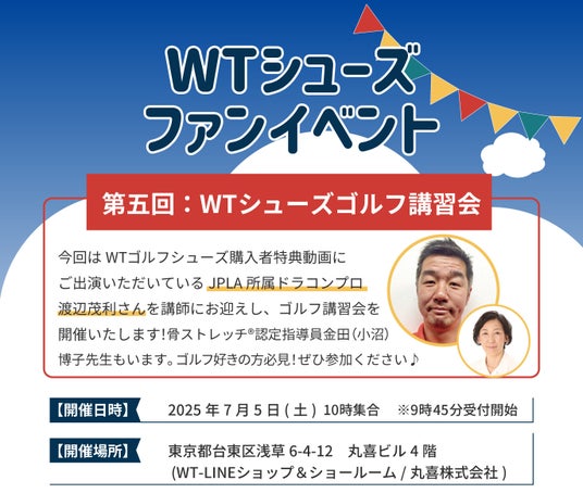 今回で五回目となるファンイベントでは、WTゴルフシューズ購入者特典動画にご出演いただいているJPLA所属ドラコンプロ渡辺茂利さんを講師にお呼びし、ゴルフ好き必見の講習会を開催します。