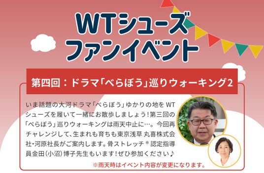 WTシューズは、履くだけで「立つ・歩く・座る」がラクになるウォーキングシューズをメインに開発しています。このイベントでは、WTシューズを提供するだけではなく、身体を動かし人とのかかわりを増やす機会を増やすことで、心身ともに健康になることを目指しています。