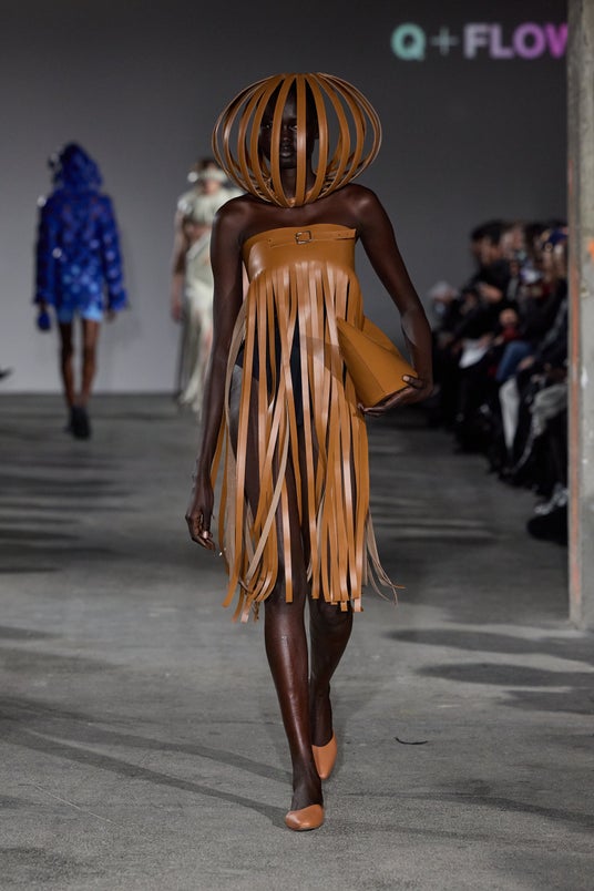 Q+FLOW (キューフロウ)は日本人デザイナーによる、国産の素材を使用し、日本の職人によって縫製されたMade in Japanのバッグ&アクセサリーブランド。常に自問自答し模索をし続け(Self-Questioning, Quest)、大きな社会の流れ(Flow)の中で成長していきたい。社会の中でブランドとしてどういう形で貢献でき、より良い循環ができるか常に挑戦したいというデザイナーの想いから生まれている。今回のショーではバッグの生産で使われなかった余りの革で衣装を制作した。