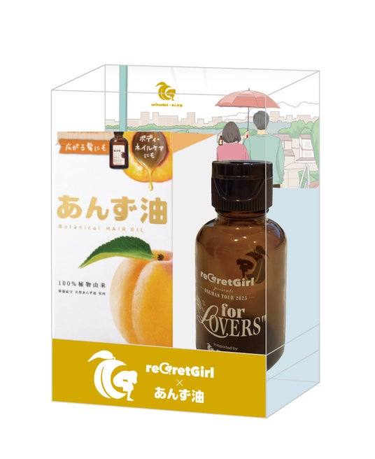 柳屋本店が、同バンドの全国ツアー「reGretGirl presents ONEMAN TOUR 2025”for LOVERS 」へ協賛をしていることをきっかけに、双方が大事にしている、人に寄り添うことを大切にする姿勢を形にしたコラボボトルを制作。柳屋あんず油とセットにした、数量限定のオリジナルボトルとしての発売となりました。