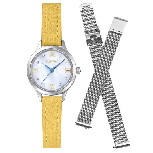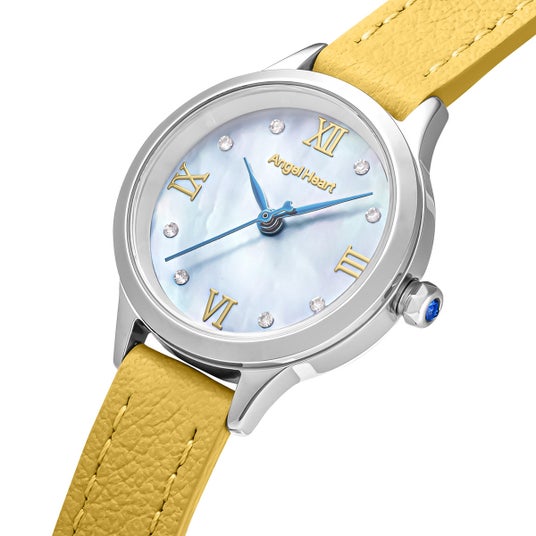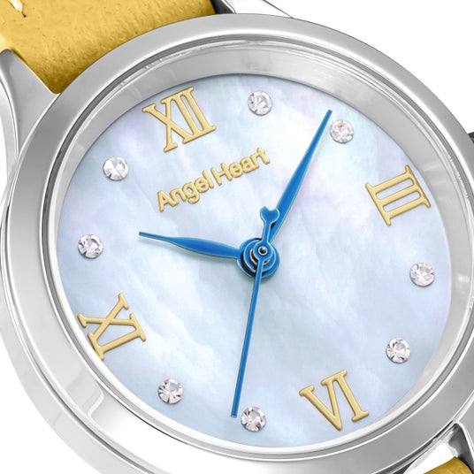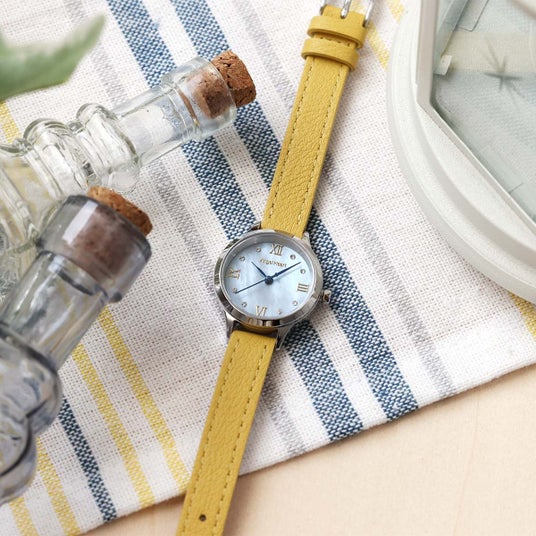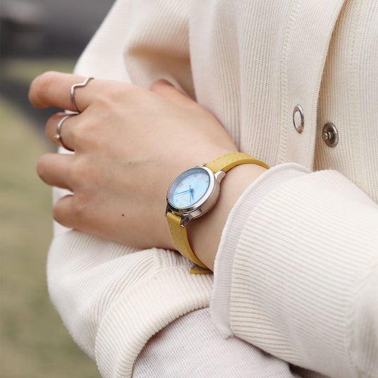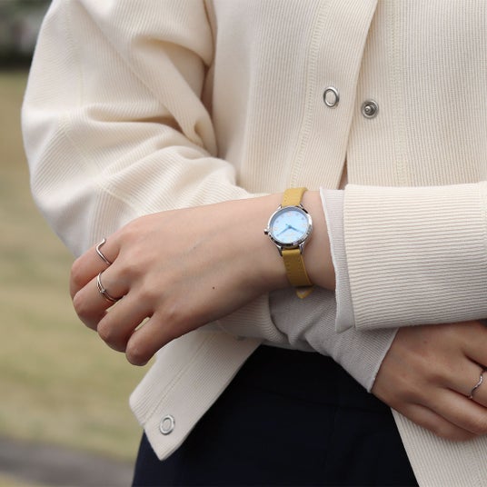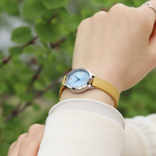 イエローゴールドカラーのインデックスとブルーの針が上品に調和し、鮮やかなコントラストが爽やか、かつ印象的な腕元を演出します。
