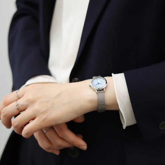 インデックスとリューズには、きらりと輝くクリスタルをセッティング。リューズにはダイヤル・針とカラーを合わせたブルーのクリスタルを組み合わせ、洗練されたまとまりと上質な輝きを備えた、完成度の高いデザインに仕上げました。