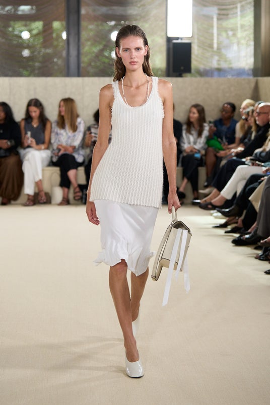 TOTEME 2026年春夏コレクションは、飾らない美しさを凝縮しています。タンクトップ、トレンチコート、パジャマセットといったブランドのアイコンがラフでありながら精緻に解体され、ほぐれた仕上げや時間を経て柔らかくなった素材の質感の開放的な融合が特徴となっています。