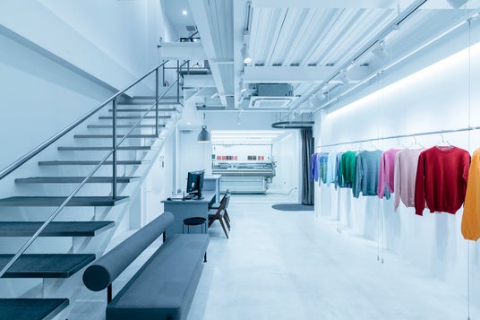 店舗内に(株)島精機製作所のホールガーメントテクノロジーを導入し、サプライチェーン不要ですべて自社で生産が完結する洋服作りを行っている。