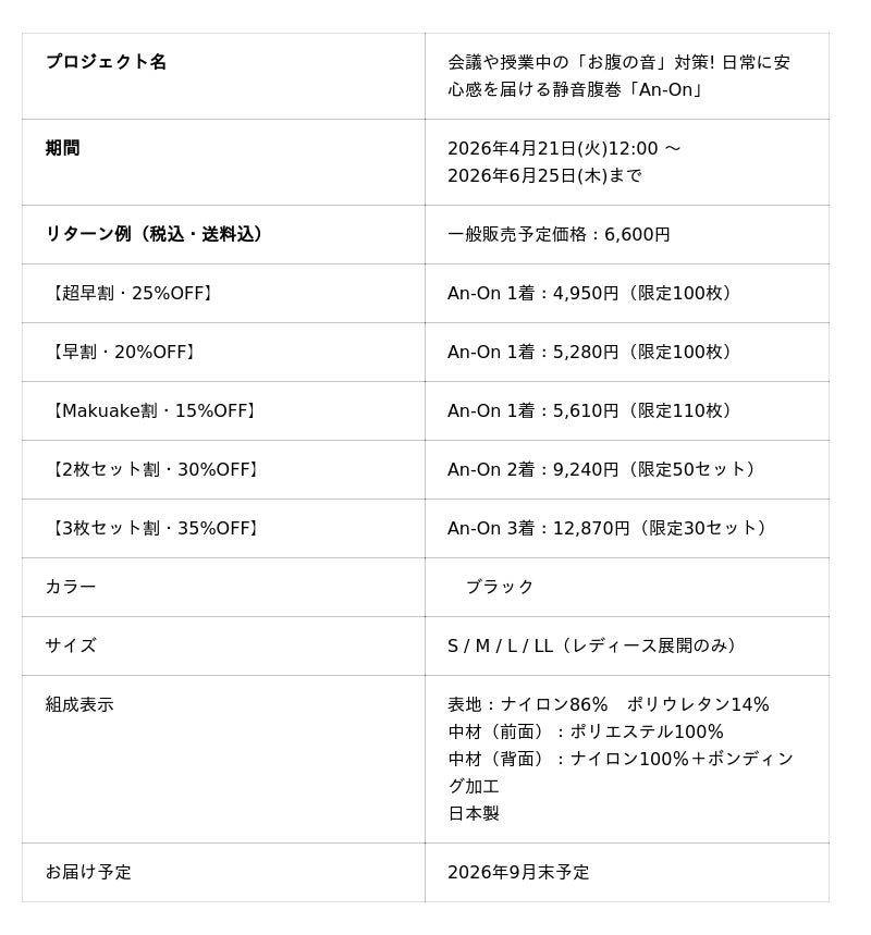 岡山を拠点にQOL向上アイテムを展開する株式会社Toride は、コントロールが難しい急な「腹鳴り(お腹の鳴る音)」を独自の3層構造で軽減する、静音腹巻「An-On」を、2026年4月21日(火)12:00より、応援購入サービスMakuakeにて先行販売を開始いたします。