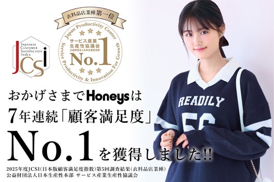 株式会社ハニーズホールディングスが展開するレディスファッション「ハニーズ」は、このたびサービス産業生産性協議会(公益財団法人日本生産性本部)が実施した「2025年度JCSI (日本版顧客満足度指数)」の衣料品店業種において、顧客満足で第1位の評価を獲得しました。2019年度以降、7年連続での第1位となります。