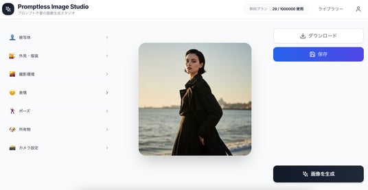 服装や髪型等をクリックするだけで豊富なバリエーションの人物画像が生成可能
