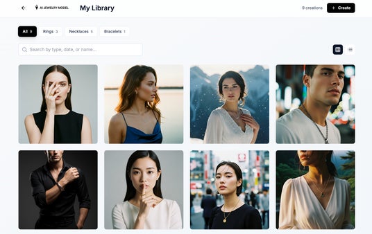 ジュエリー画像をアップするだけで、AIが人の画像を解析し、最適な角度と光でリアルな着用ビジュアルを自動生成します。